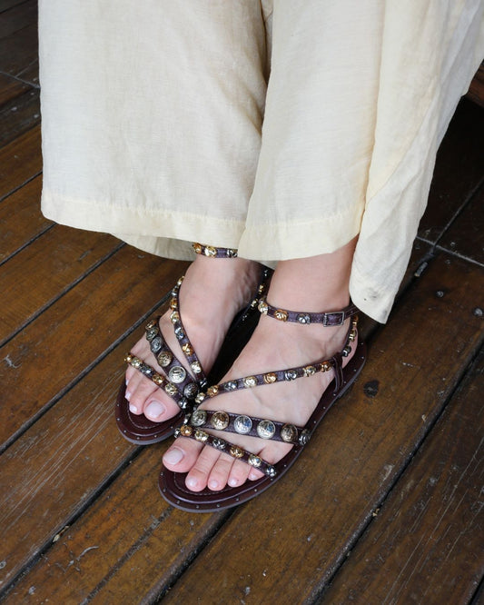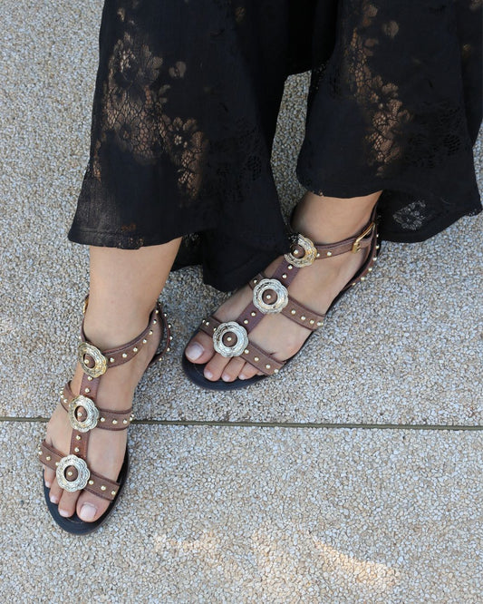 Sandália Aplicações Salto Baixo Em Couro Marrom Narcisa