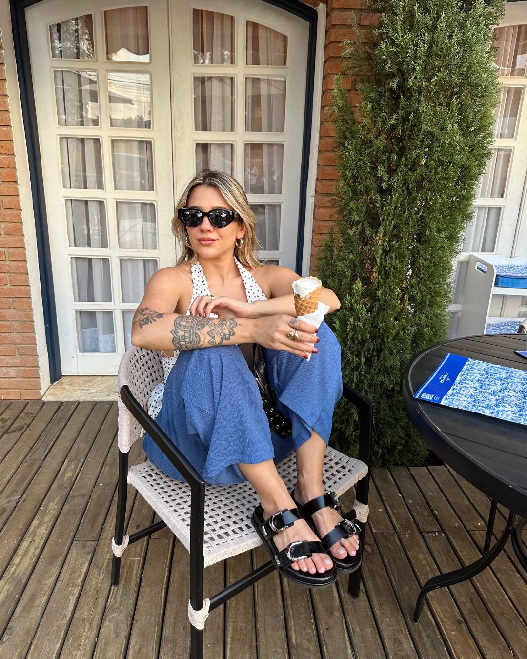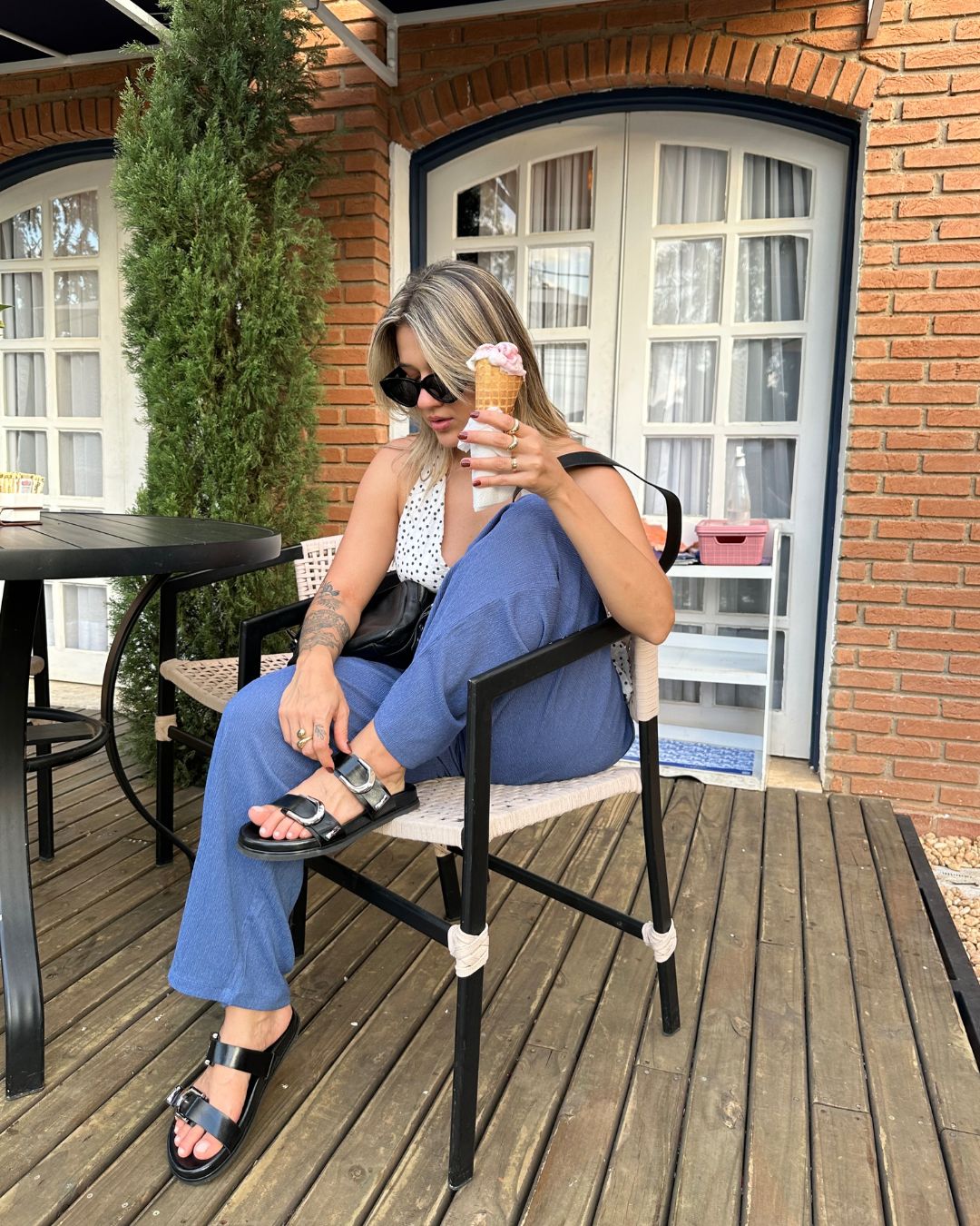 Com solado confortável e tiras largas que abraçam o pé, ela combina com vestidos fluidos, alfaiataria, jeans ou até aquele shortinho de verão. Um toque urbano, versátil e atemporal para seu closet.