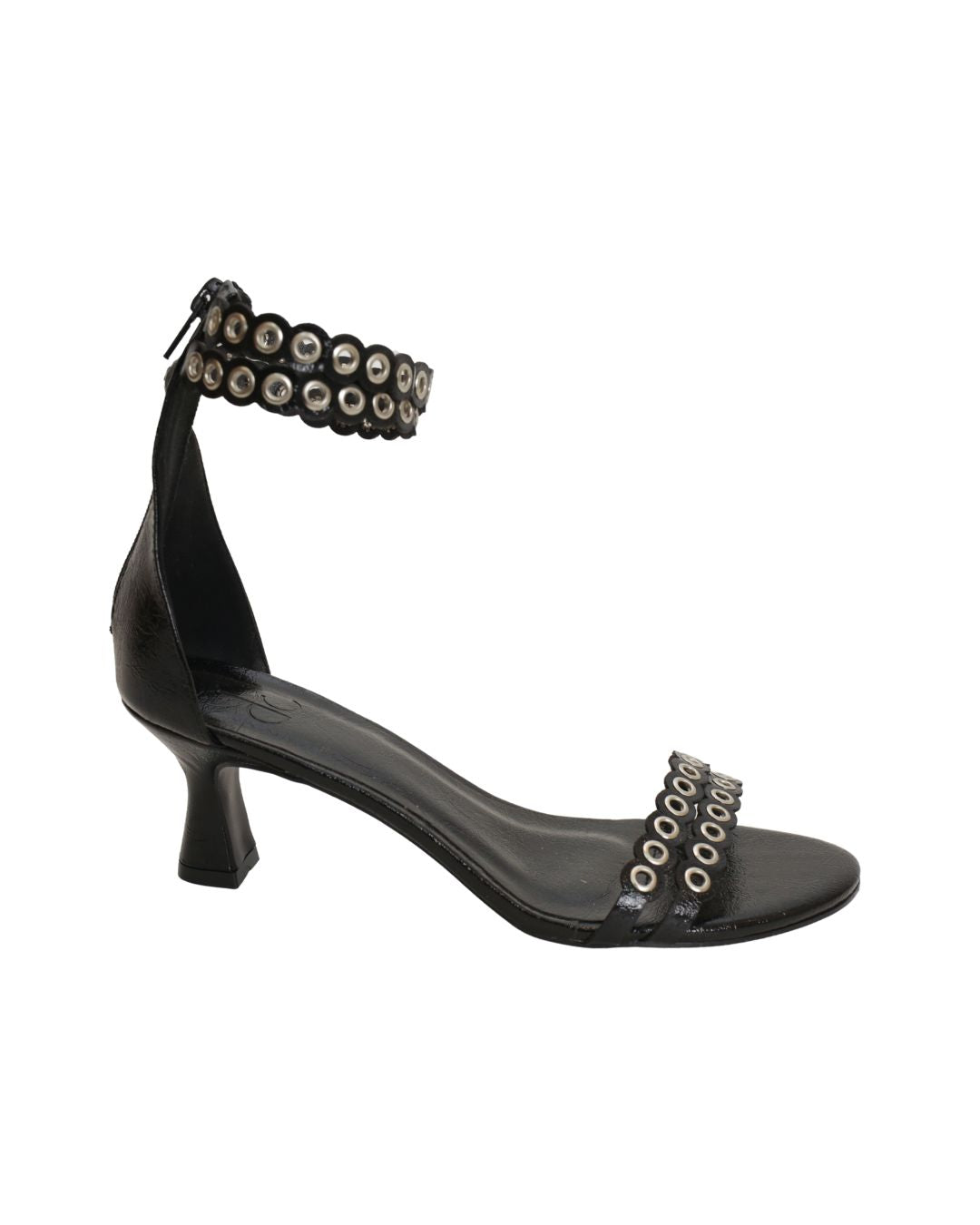 Confeccionada no couro sintético, baby salto de 6 cm, zíper traseiro, ilhós em prata