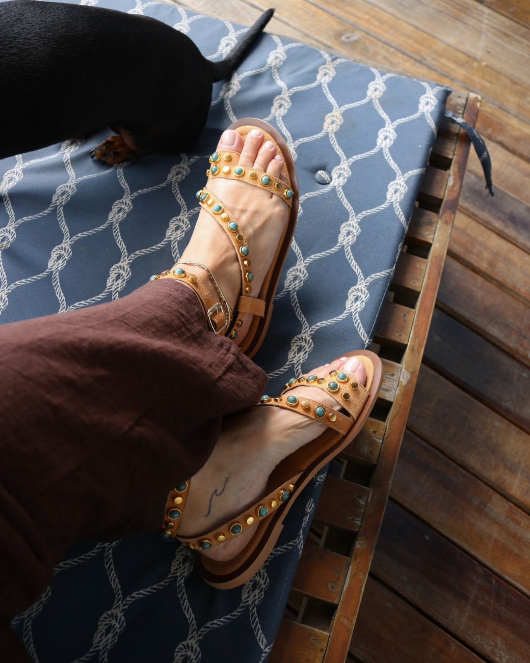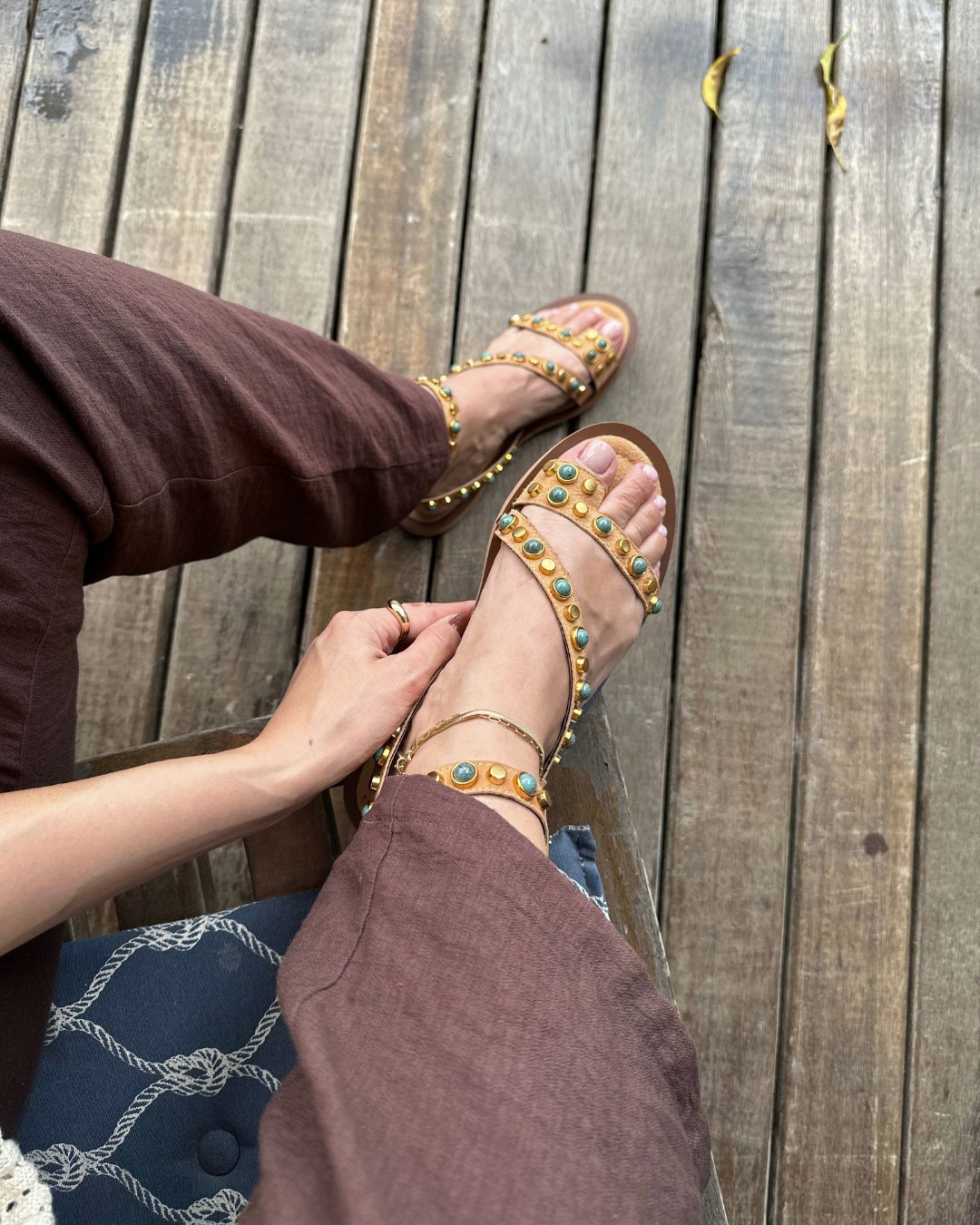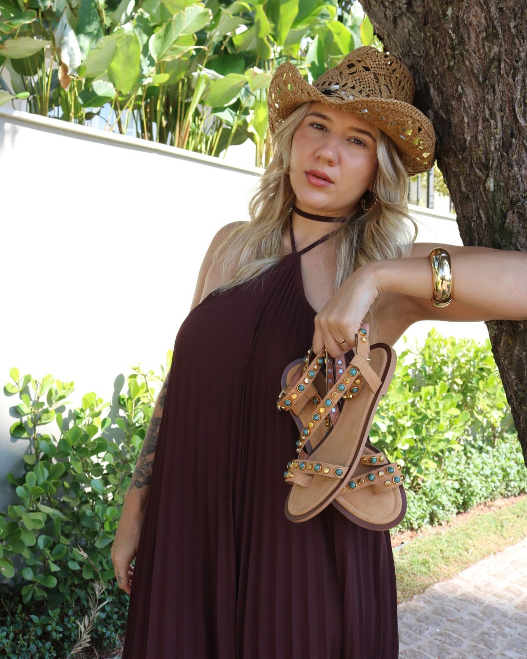 A sandália Clara é aquele mix perfeito entre estilo e conforto. Confeccionada em camurça, ela traz tiras delicadas com aplicações em pedras verdes e detalhes dourados que adicionam um charme boho chic ao look. Versátil e confortável, vai do passeio de fim de semana ao jantar de verão sem esforço.
