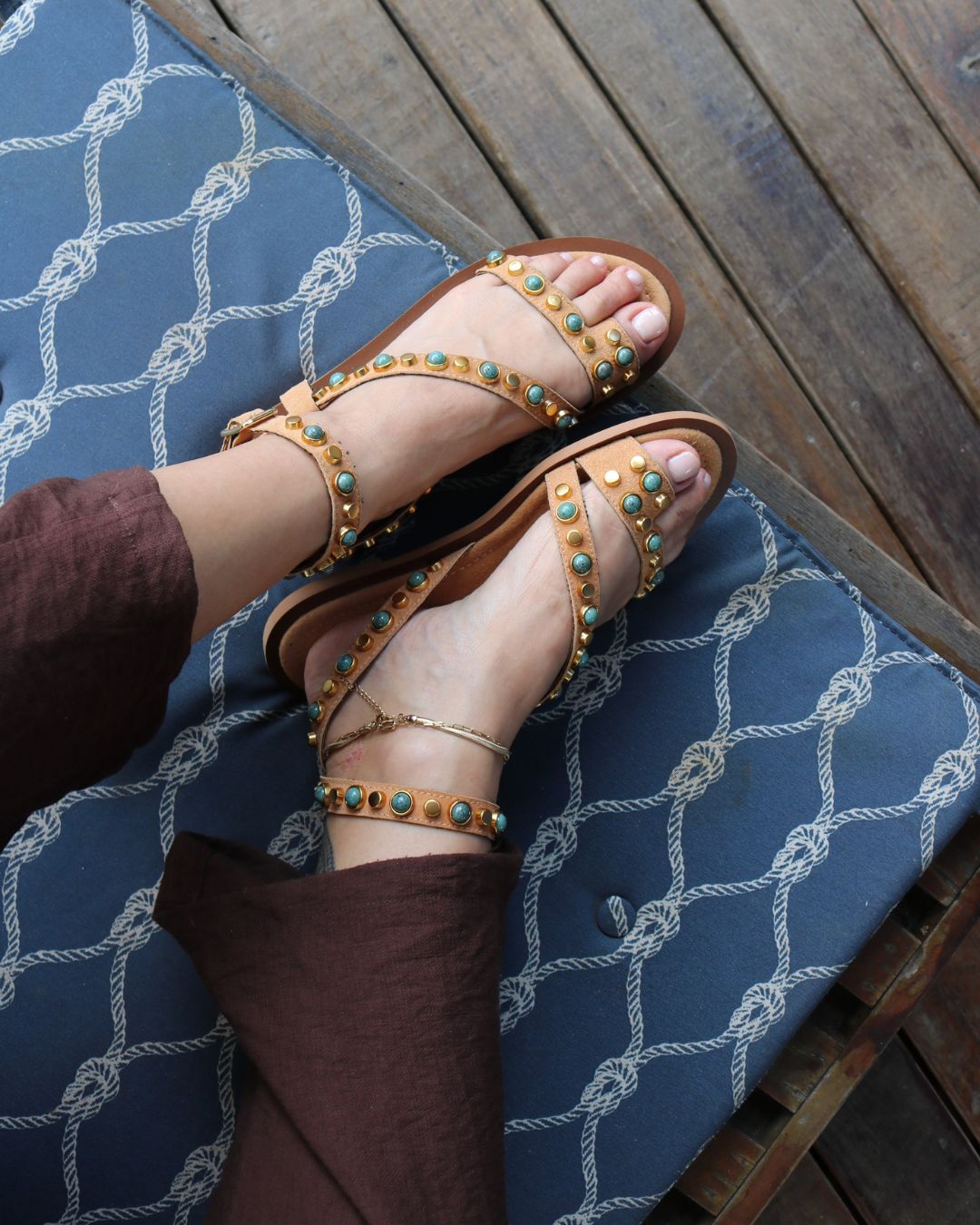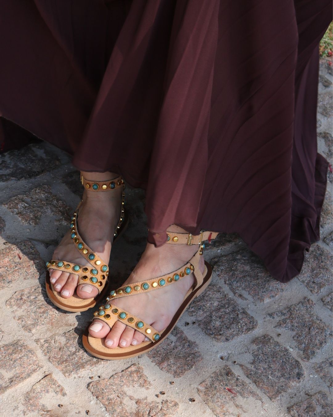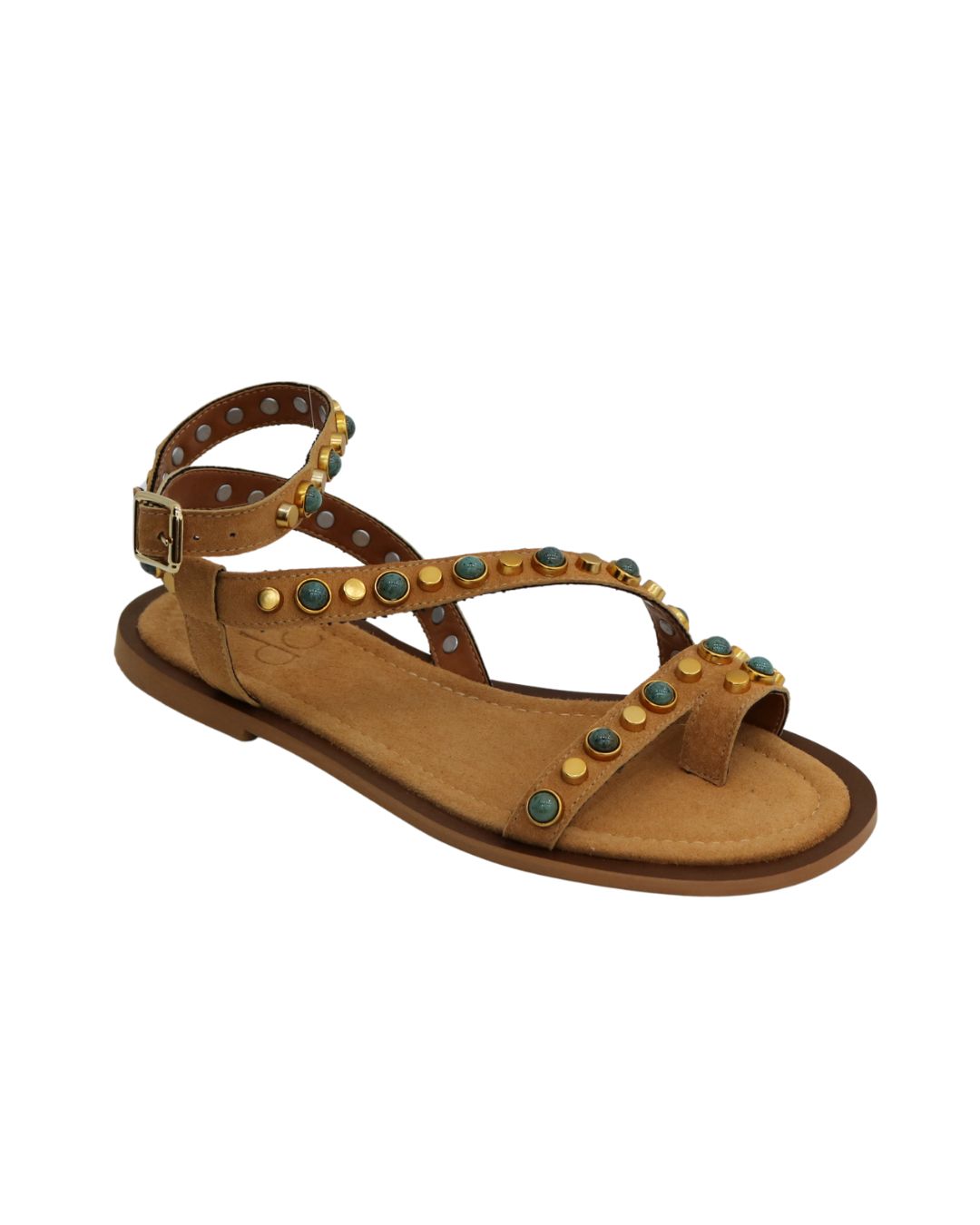 A sandália Clara é aquele mix perfeito entre estilo e conforto. Confeccionada em camurça, ela traz tiras delicadas com aplicações em pedras verdes e detalhes dourados que adicionam um charme boho chic ao look. Versátil e confortável, vai do passeio de fim de semana ao jantar de verão sem esforço.
