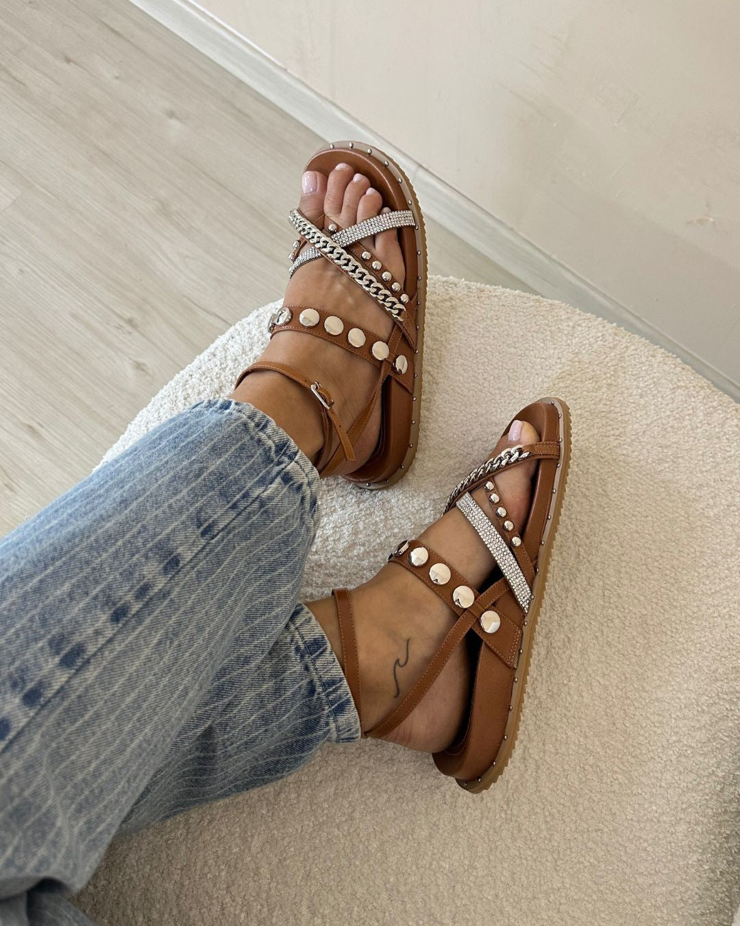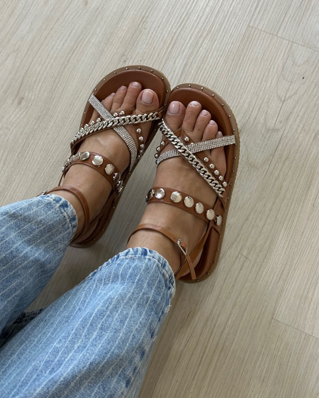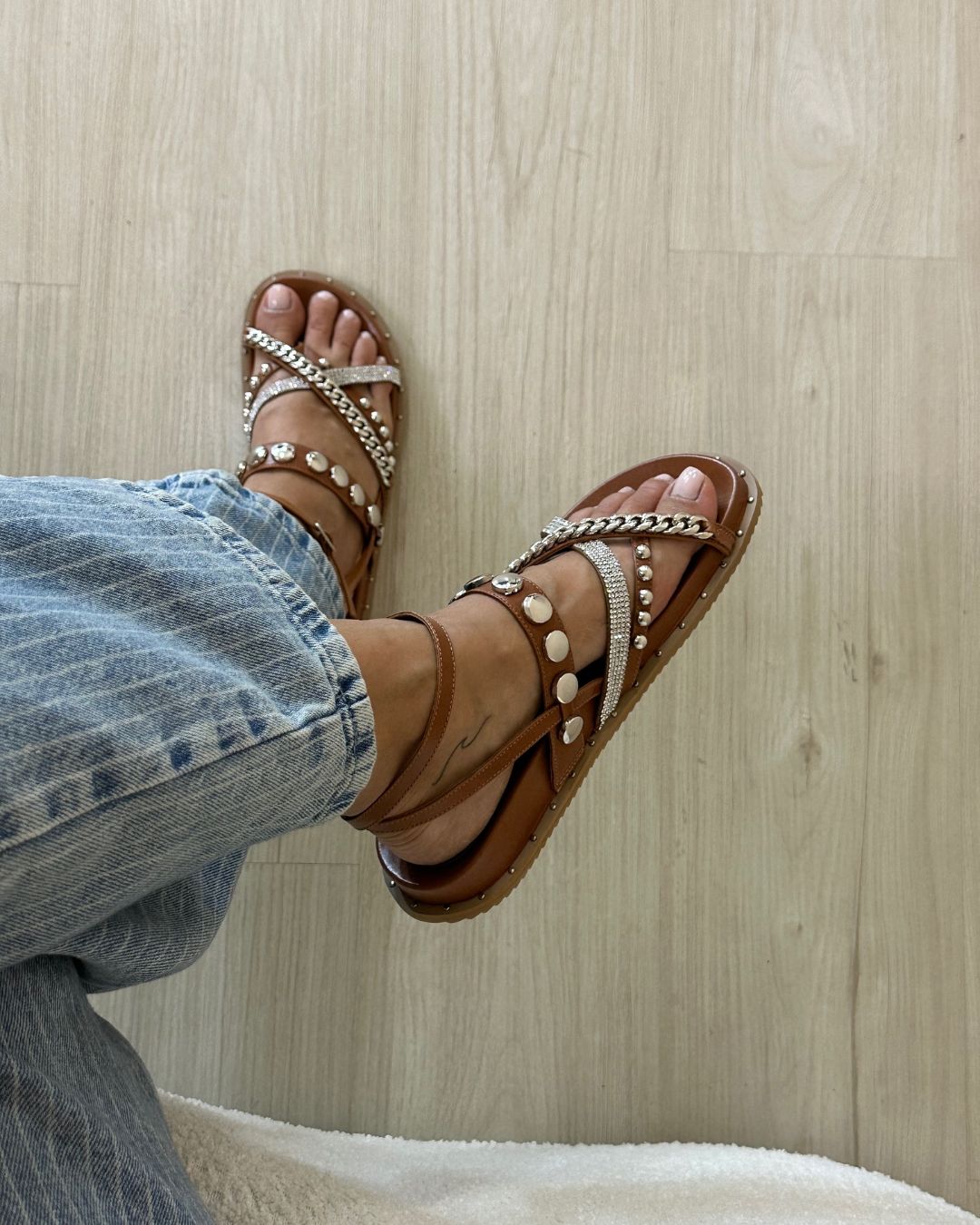 Sandália papete em couro caramelo com aplicações metálicas e detalhe em corrente e pedrarias, ideal para um look moderno e cheio de atitude. Esse modelo Joana combina o conforto da papete com o estilo urbano dos metais e do brilho, criando uma sandália versátil que eleva qualquer produção. Perfeita para quem busca um visual casual com um toque de sofisticação.