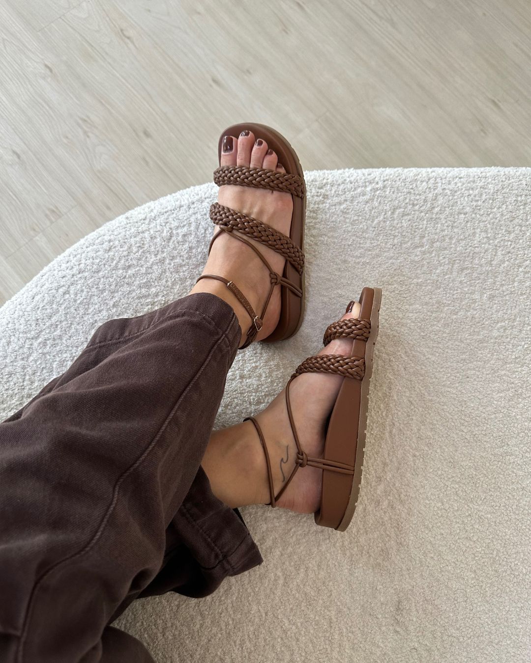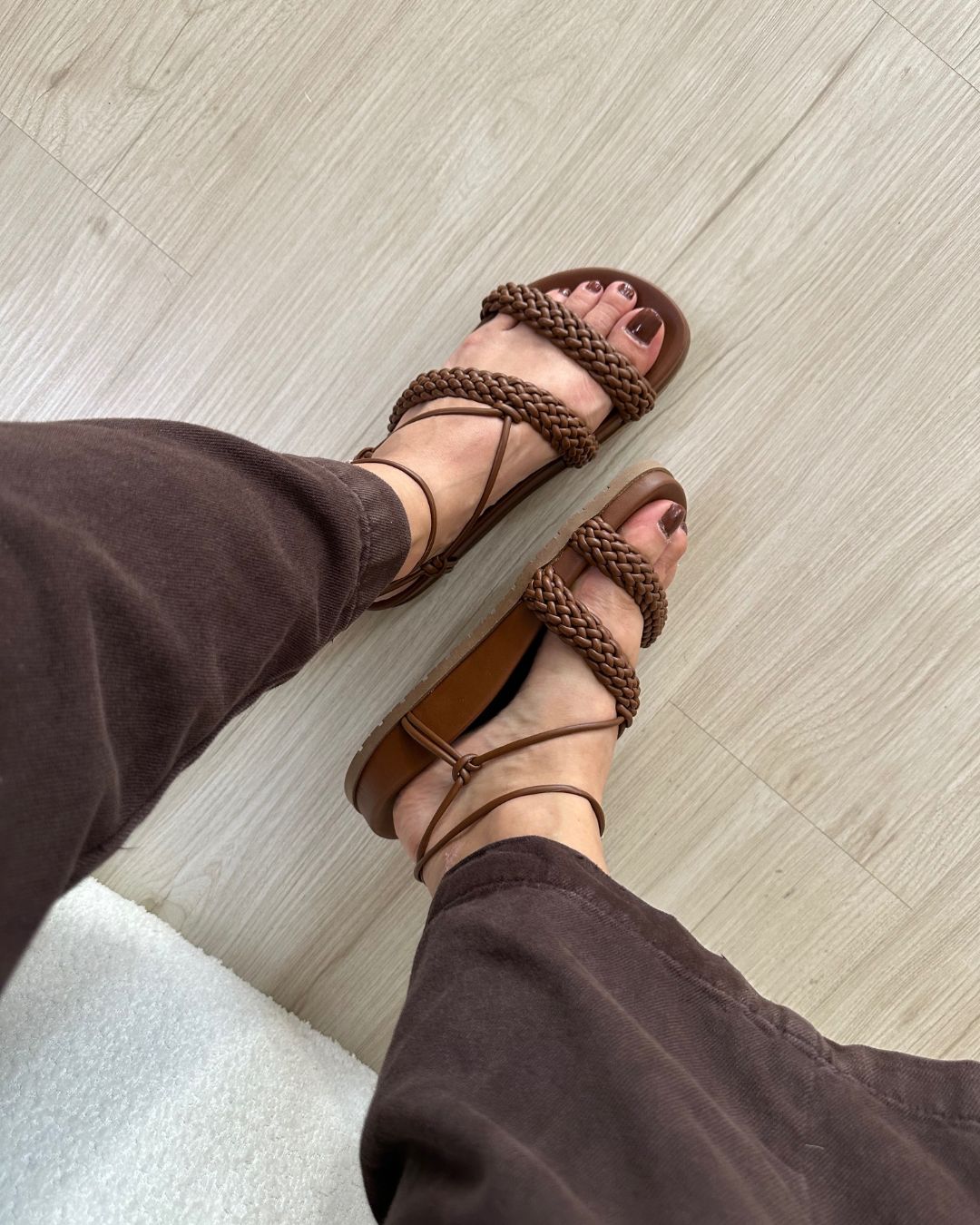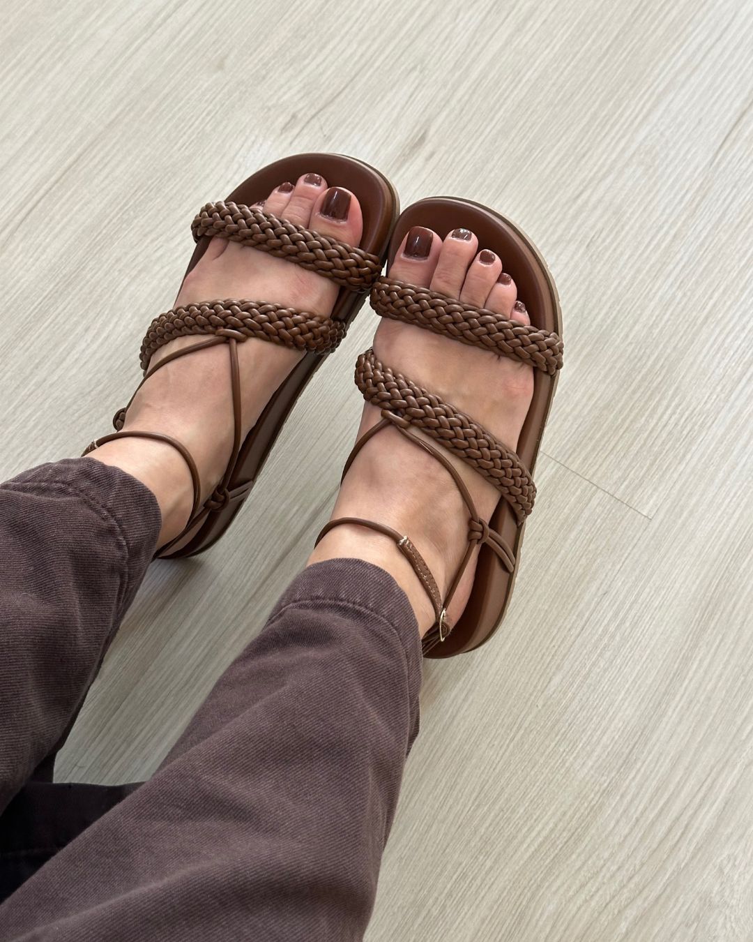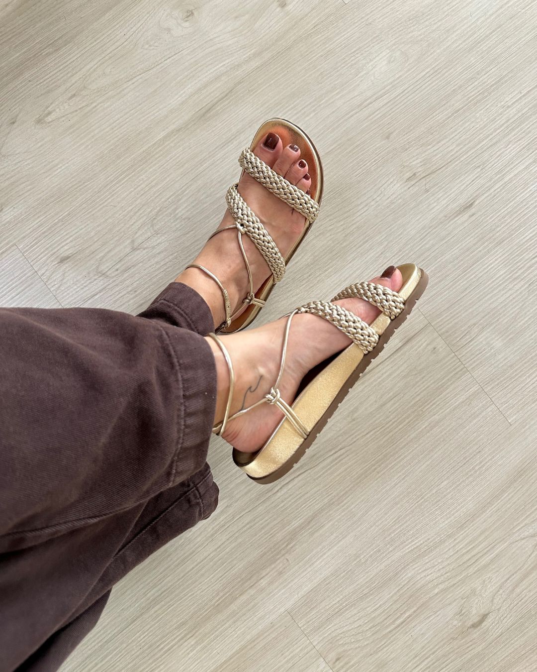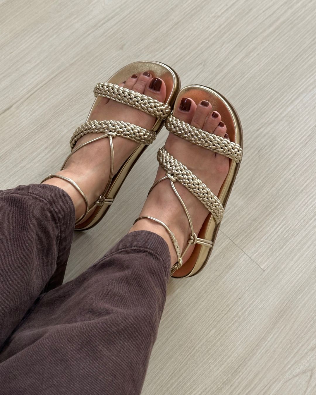 Sandália papete com tiras trançadas, disponíveis nas cores dourado e marrom, que combinam estilo e conforto. O design trançado confere um charme artesanal ao modelo, ideal para compor looks leves e descontraídos. Com fechamento ajustável, essas sandálias são perfeitas para o dia a dia e para quem busca praticidade sem abrir mão do estilo.