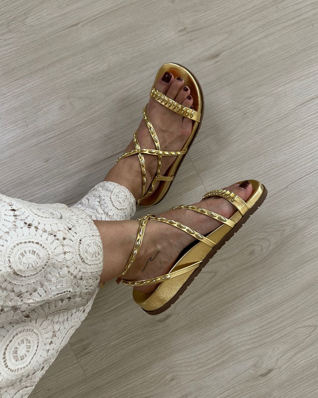 Sandália estilo papete disponível nos tons metalizados dourado e bronze, suas tiras com aplicações delicadas que adicionam um toque sofisticado e moderno ao look. Com design cruzado, esse modelo é ideal para quem busca uma opção estilosa e confortável para o dia a dia. Perfeita para complementar produções casuais com um toque de elegância.