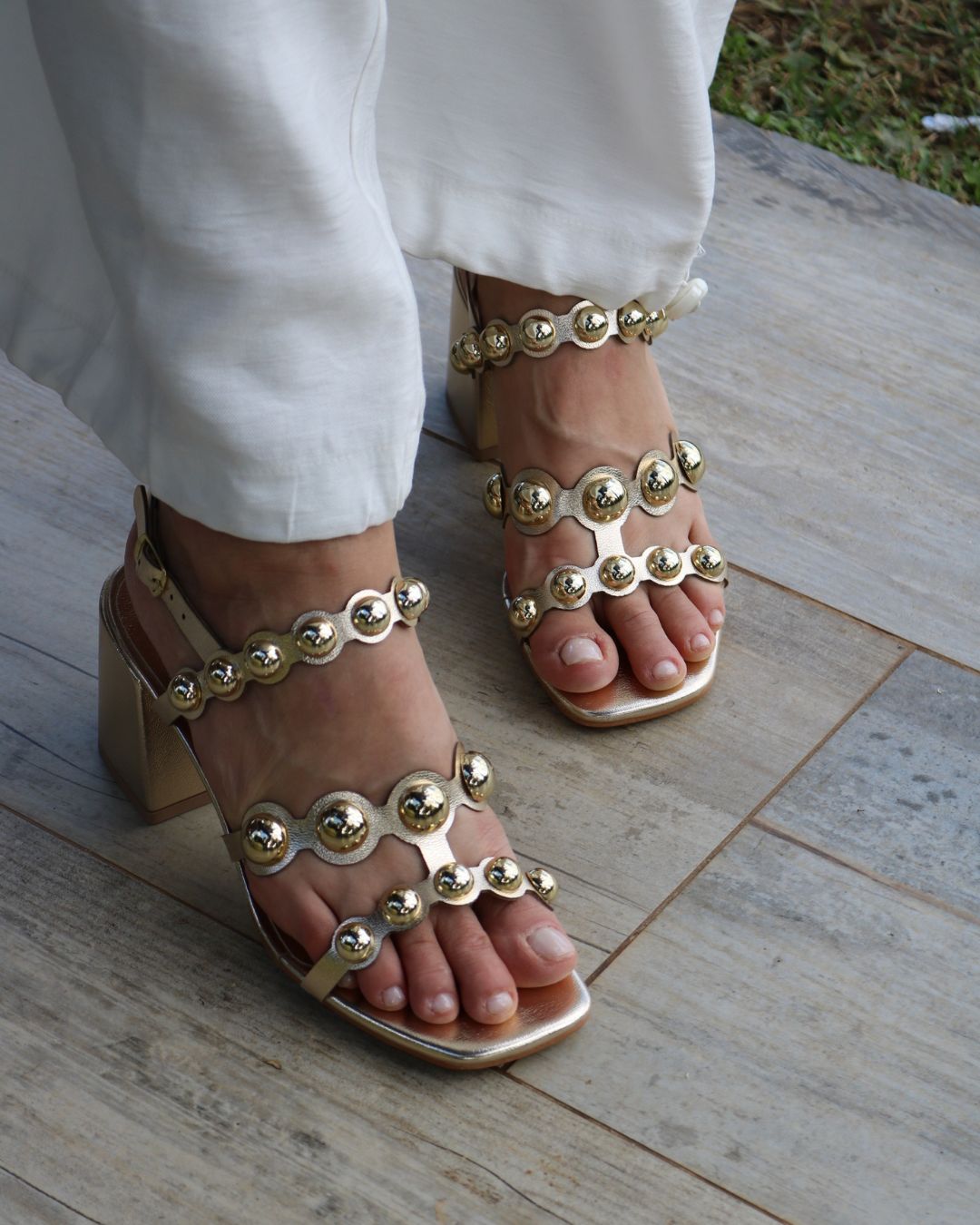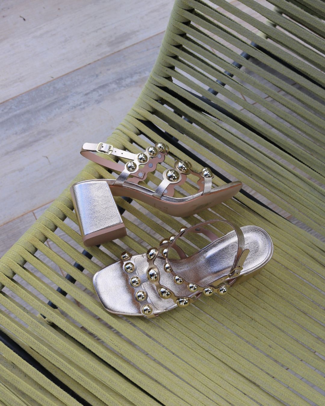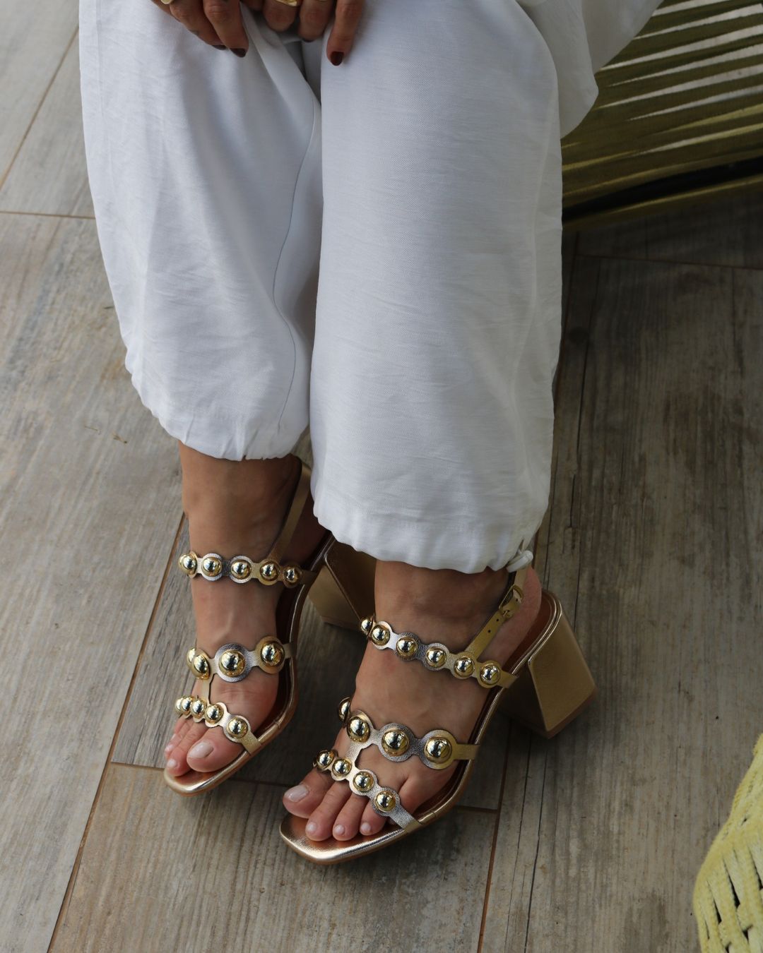 O dourado que brilha sem exagero. Nossa sandália com tiras adornadas por esferas metálicas é perfeita para transformar qualquer look – do jeans básico ao vestido de festa. O salto bloco de 7,5 cm garante conforto para você dançar, caminhar e aproveitar cada momento com estilo. Versátil e nada óbvia, ela é aquele toque fashion que faz diferença na produção