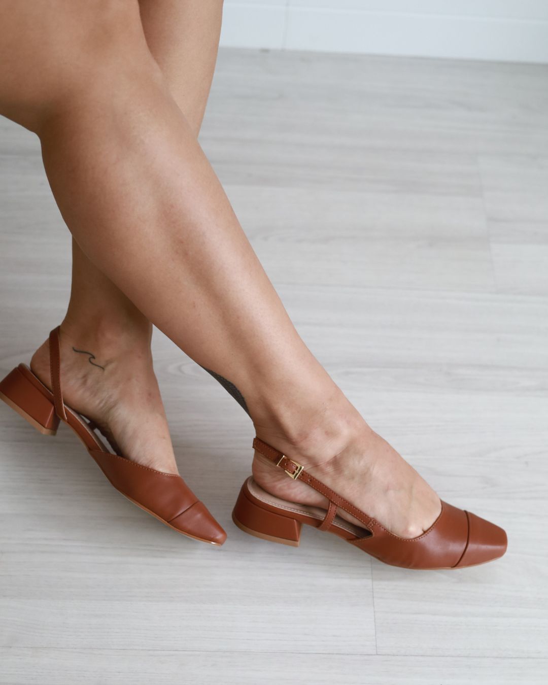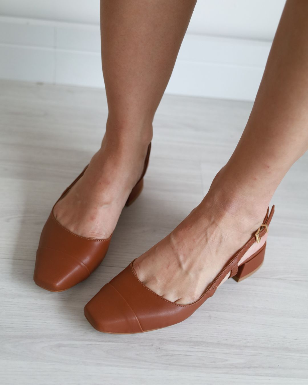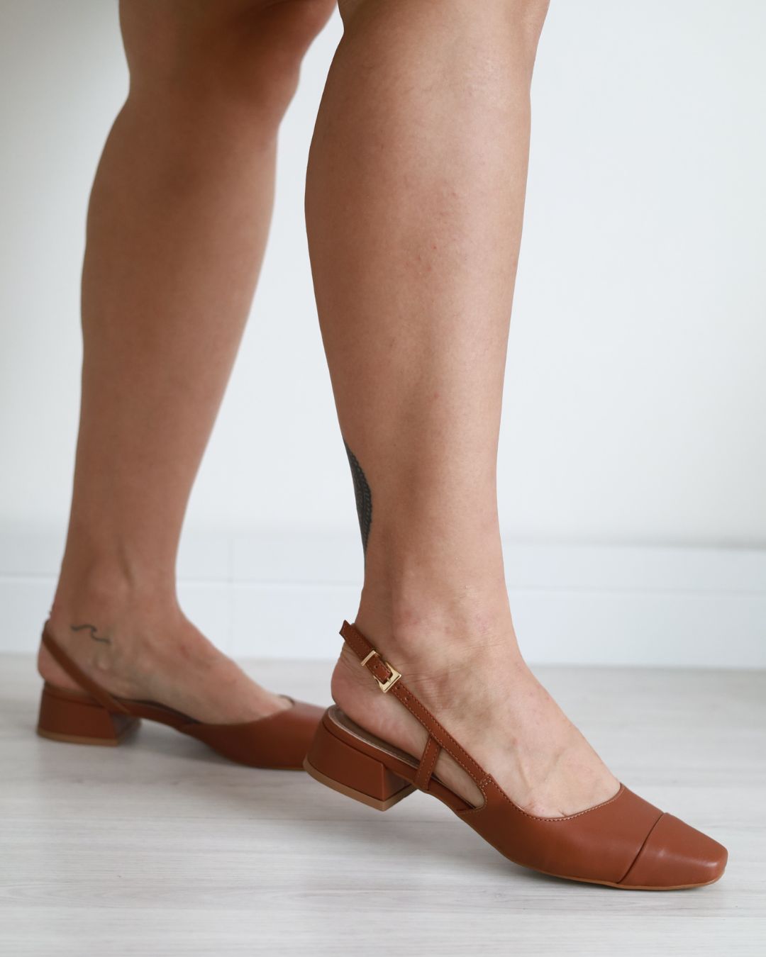 Confeccionada no couro sintético, salto bloco de 2 cm, tira com regulagem