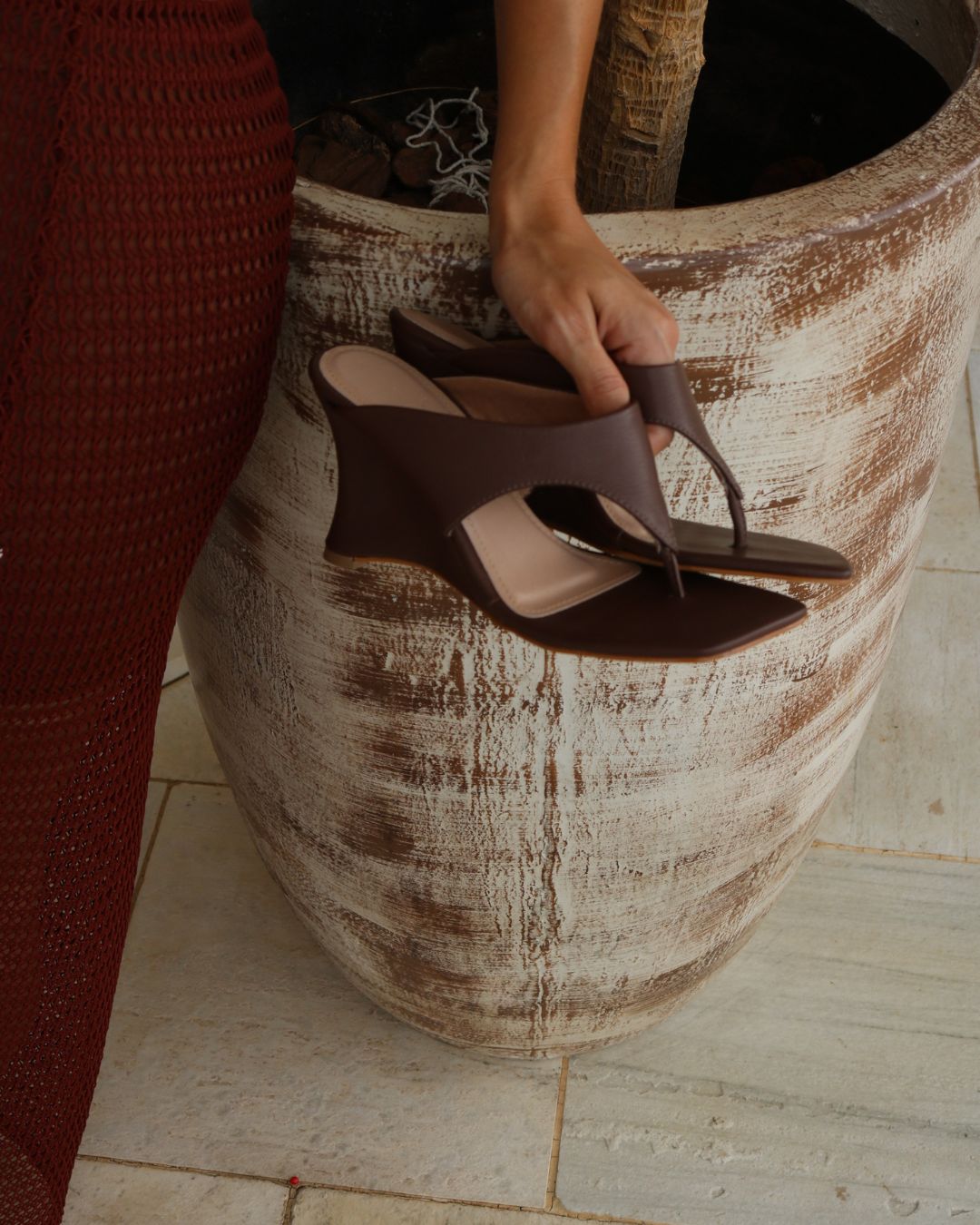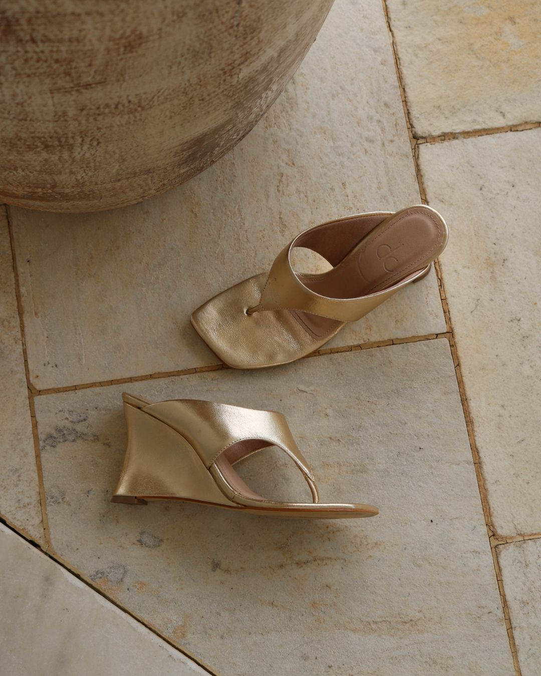 Elegância leve no dia a dia. O tamanco wedge dourado da Dulce Chapot traz aquele design sofisticado que funciona do look casual ao refinado. O modelo é minimalista, bico quadrado moderno e tira em couro macio que abraça o pé com conforto. O salto wedge mantém estabilidade sem perder a delicadeza.