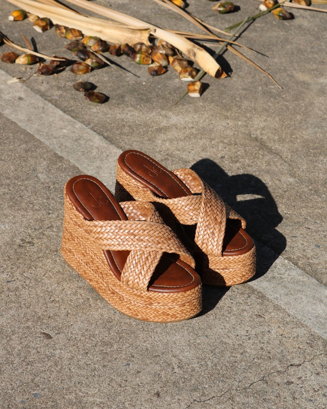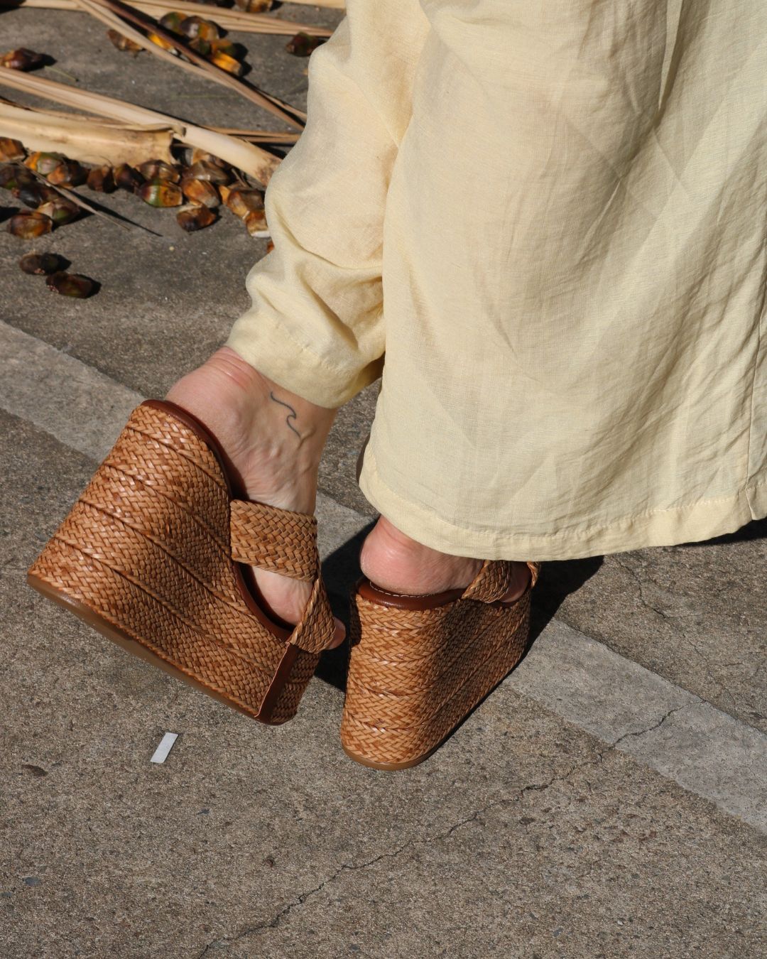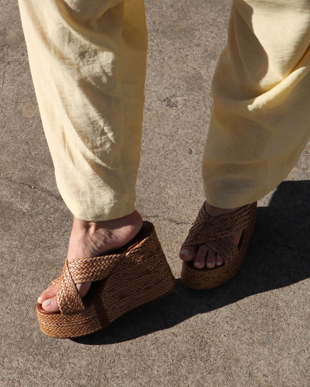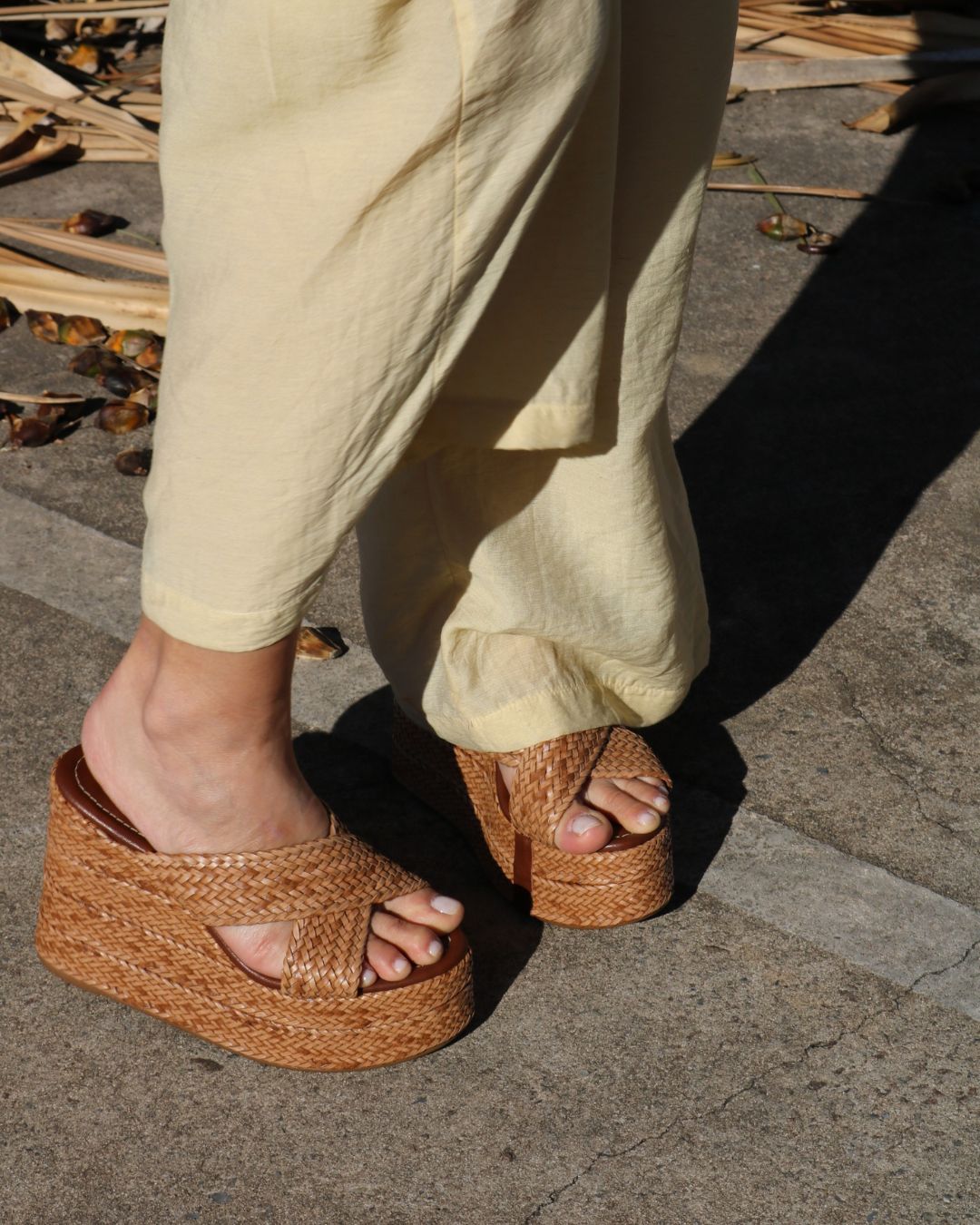 A cara do verão: a Flatform Trama Natural traz tiras largas cruzadas em efeito palha trançada, que entregam frescor e estilo sem esforço. O salto plataforma robusto garante altura e conforto ao mesmo tempo, criando uma silhueta alongada e super atual.