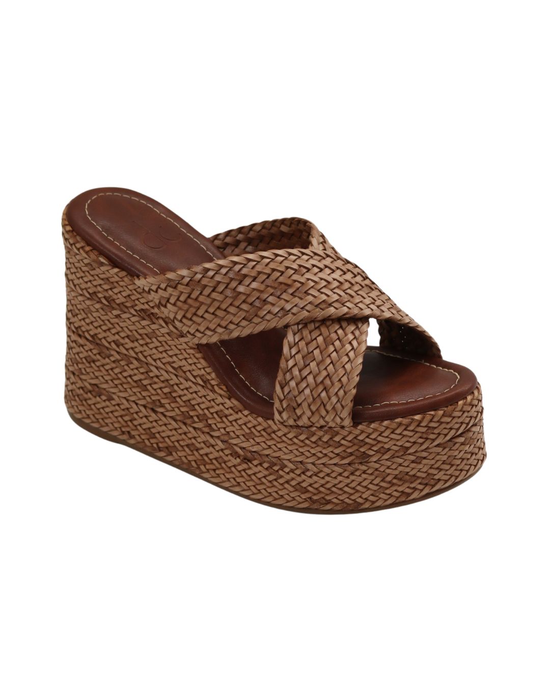 Confeccionada em couro sintético tramado, palmilha confort, plataforma de 12 cm